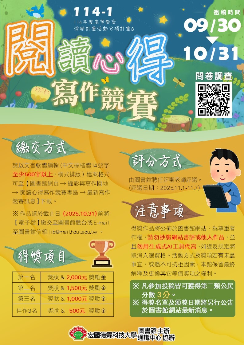 ◆ 評分方式:由圖書館聘任評審老師評選 (評選日期:2025.11.1-11.7)。